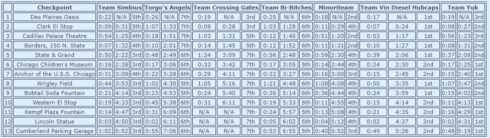 Team Simbius: Hint on Checkpoint 8 (Wrigley Field), hint and answer on Checkpoint 10 (Western El Stop) for a total of 30 minutes.