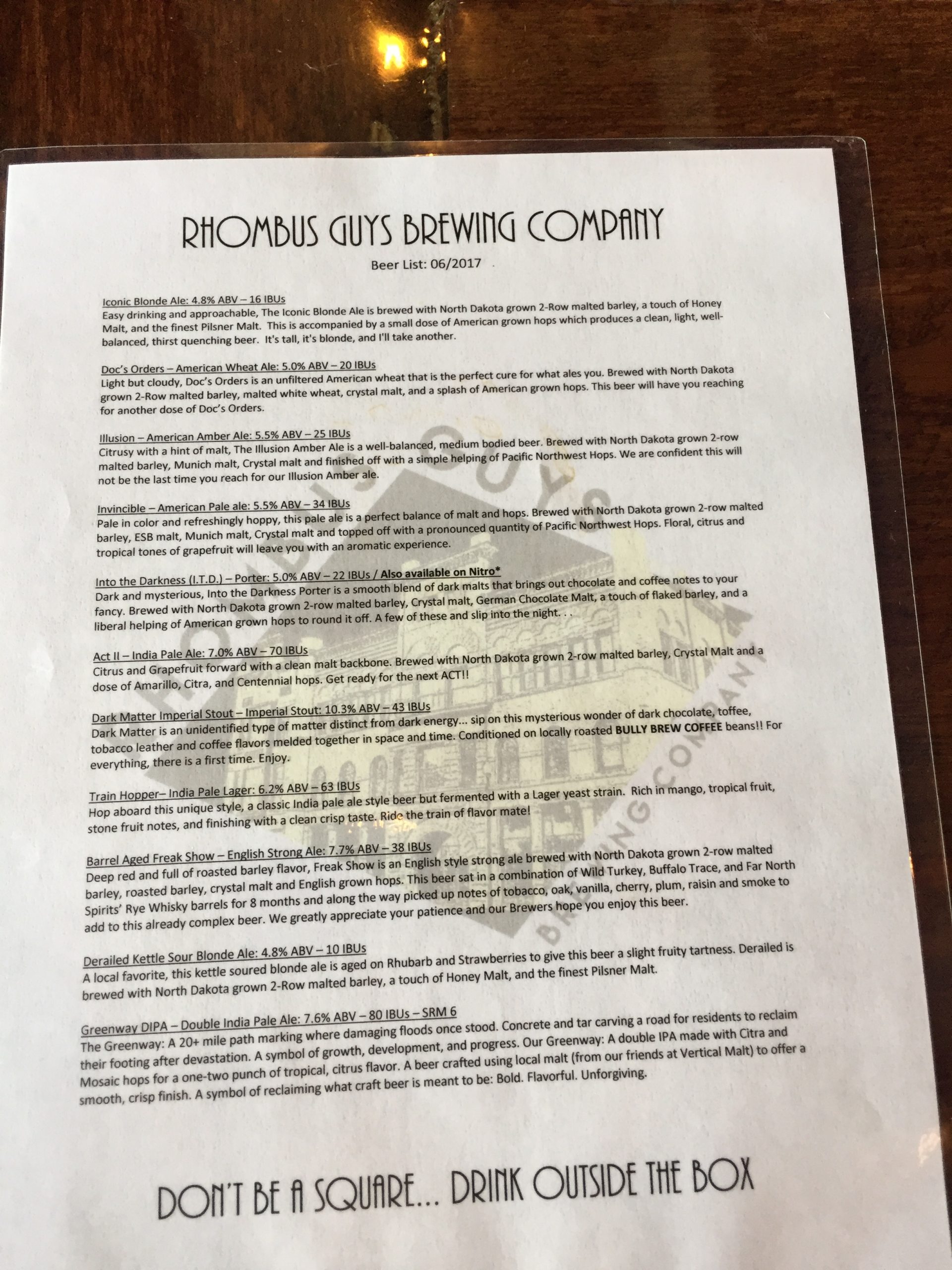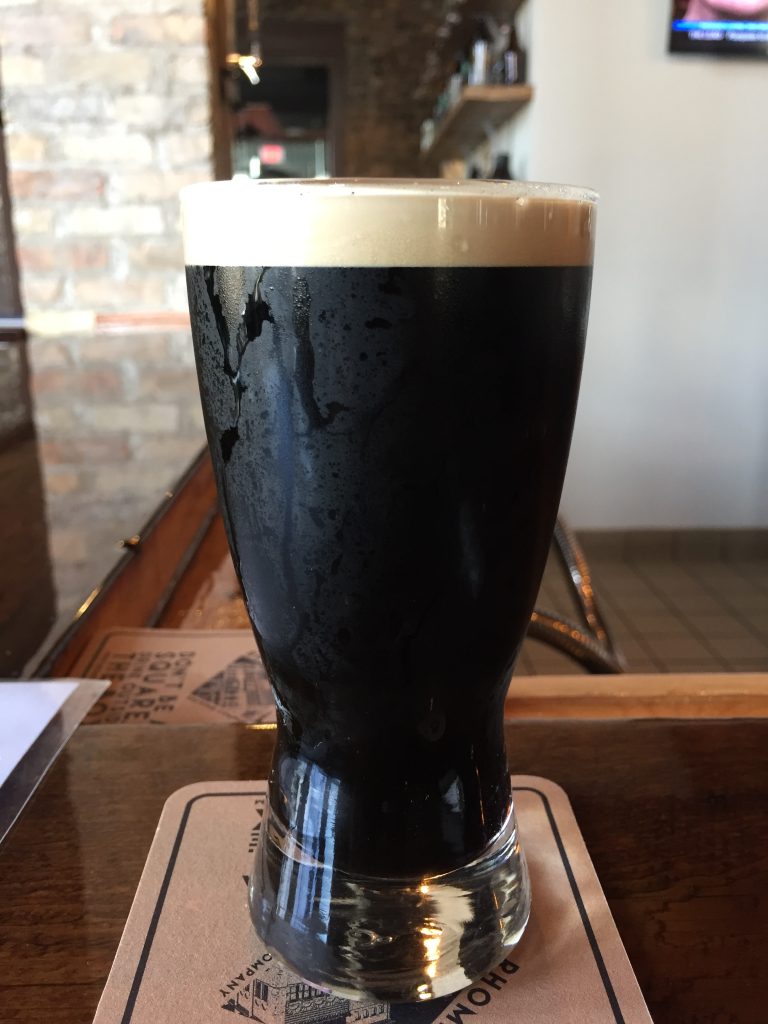 At lunchtime I was coming up on Grand Forks, North Dakota, so I detoured to a brewery I scoped out the day before: The Rhombus Guys Brewery. They have a respectable beer menu and tasty food (with enormous portions). I had the Dark Matter Imperial Stout, which was delicious!