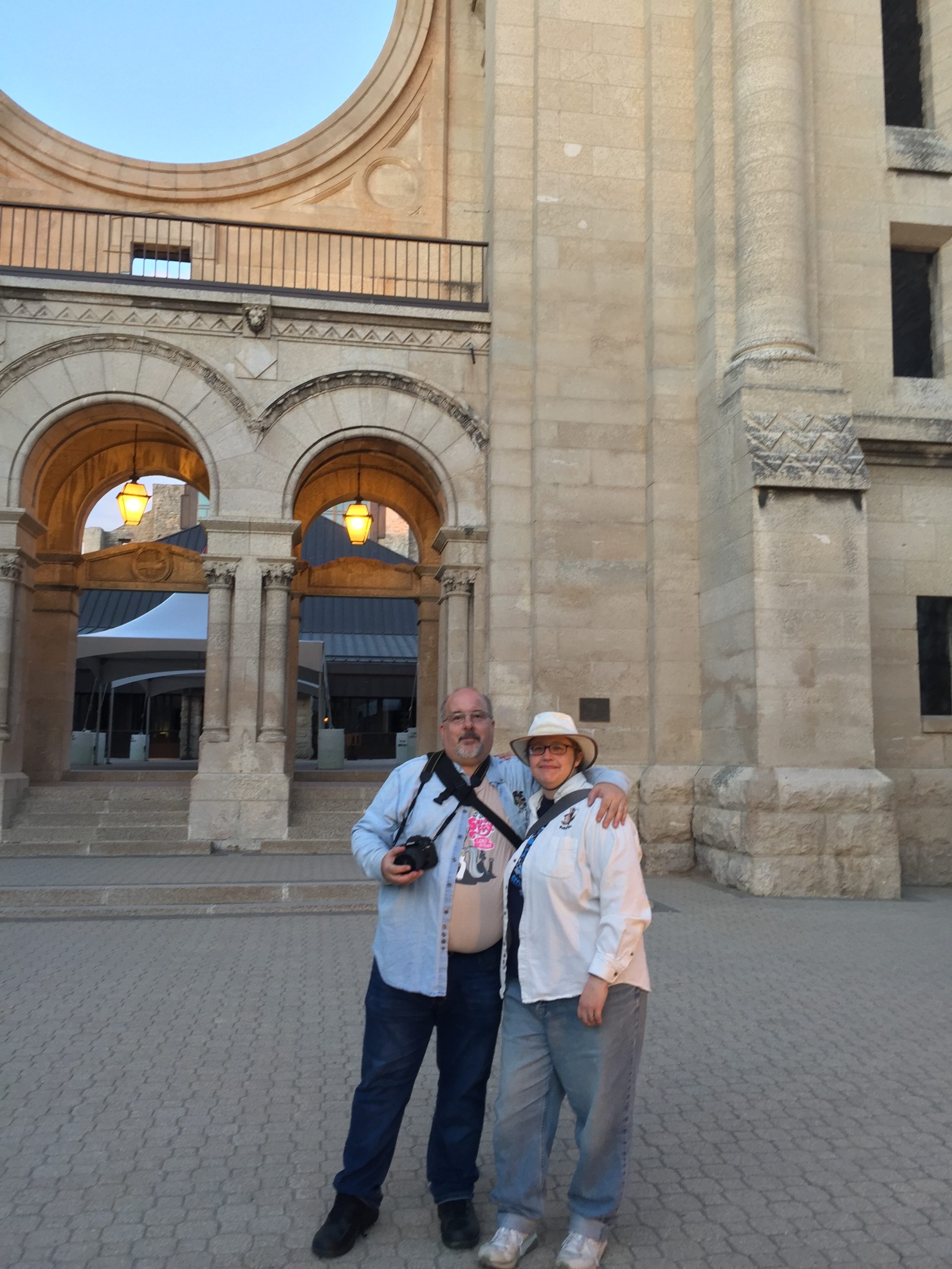 My wonderful guides here in Winnipeg, Plonq and Atara, in front of the Winnipeg Cathedral.