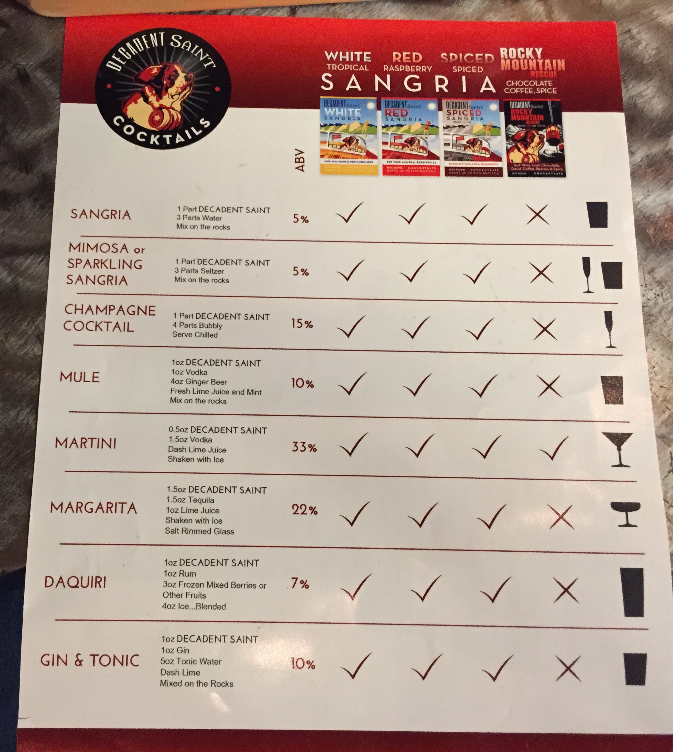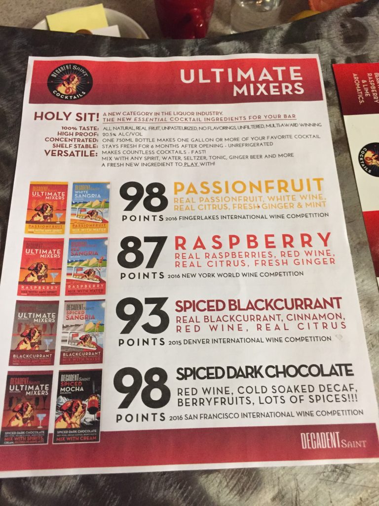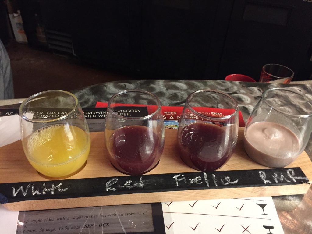 Having heard some entertaining things about them on the podcast Kevin and Ursula Eat Cheap (specifically Episode 250, “Giraffe Snuff Film”), I drove up to Boulder to check out Decadent Saint/Wild Cider. The ciders were…OK. Nothing that particularly excited me, though the Lemon Basil Cider was pretty good. The Decadent Saint products were far more interesting, though. They are a wine-based spiced concentrate that is made to be mixed with cocktails or diluted and consumed on its own. Apparently they have had a hard time marketing this since there were two different variations of labels for the four products, all with different names. Currently they are calling them “sangrias” although it’s a bit odd to call something that looks like chocolate milk a sangria.
