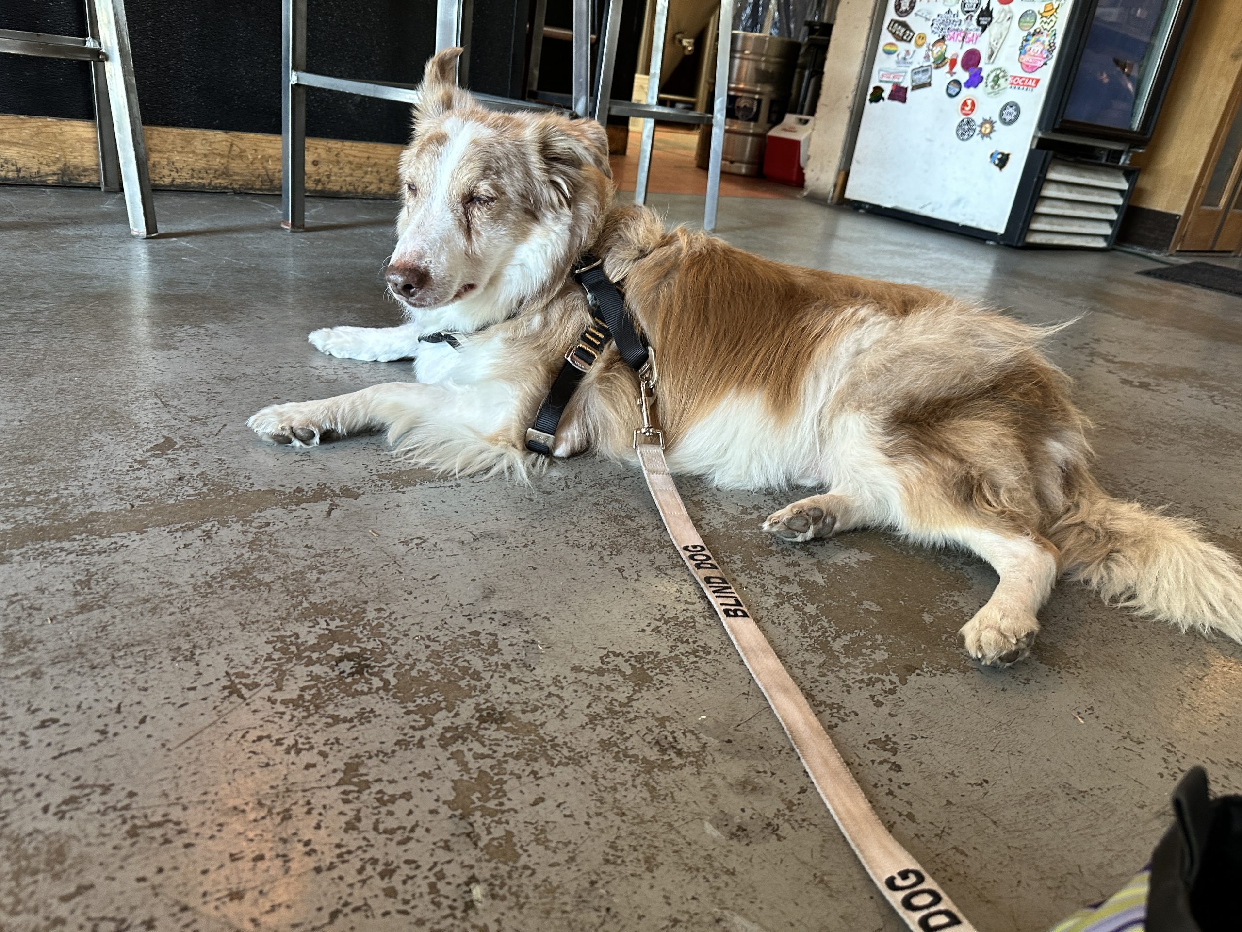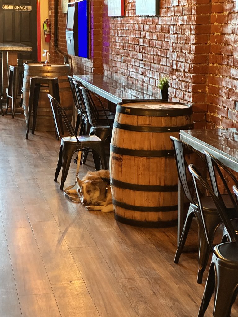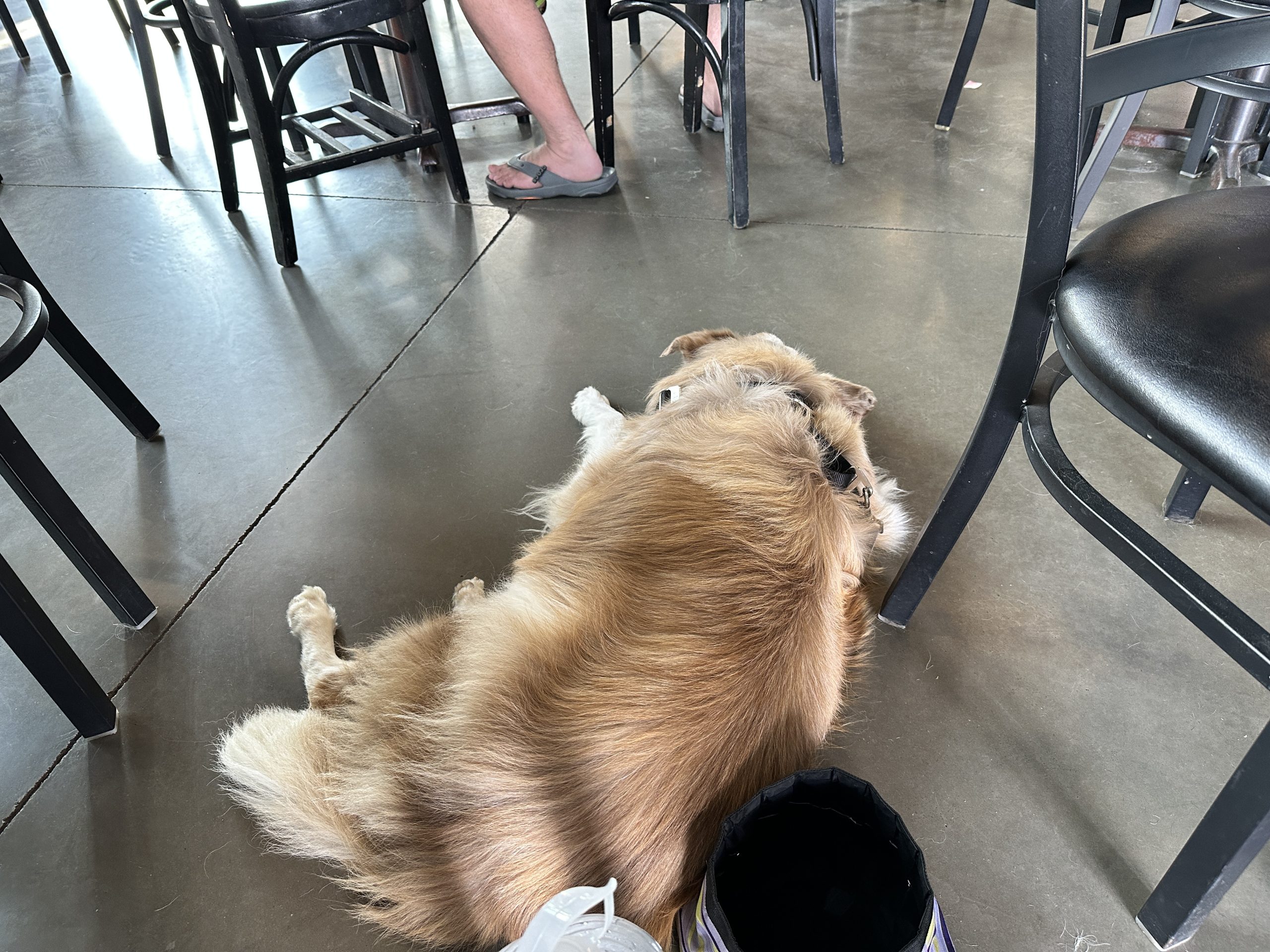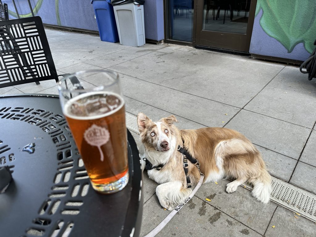 My last stop of the day was back to an old favorite: Bruz Brewing, which specializes in Belgian beers. I love the vibe of the pace, and it wasn’t even remotely crowded. I wound up spending three hours there, getting dinner from the food truck. Charlie enjoyed relaxing on the cool concrete floor, and I enjoyed people watching as couples and families came and went. We also got to meet Willow, a white German shepherd mix. She says, “’Sup?”
