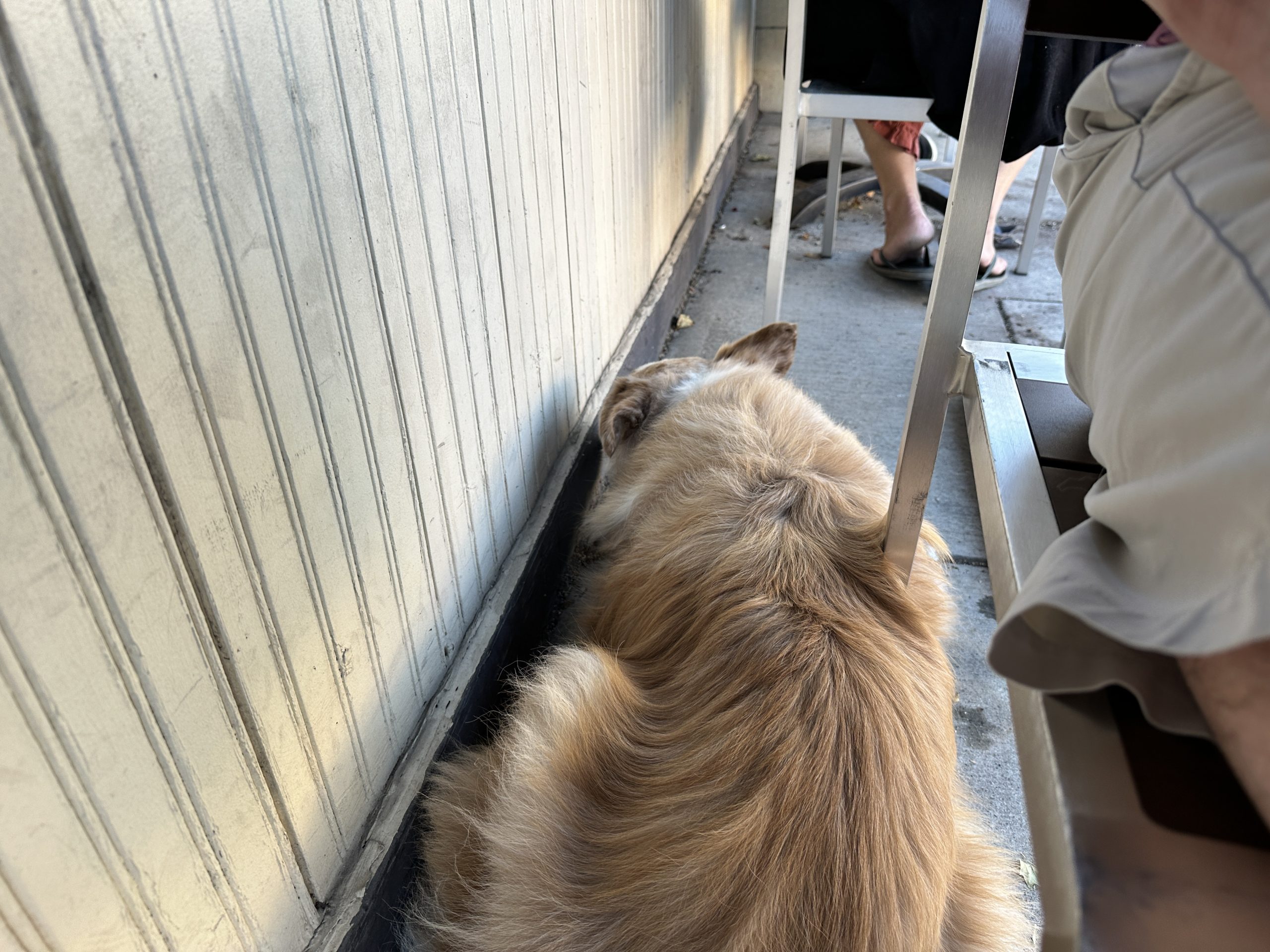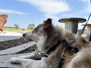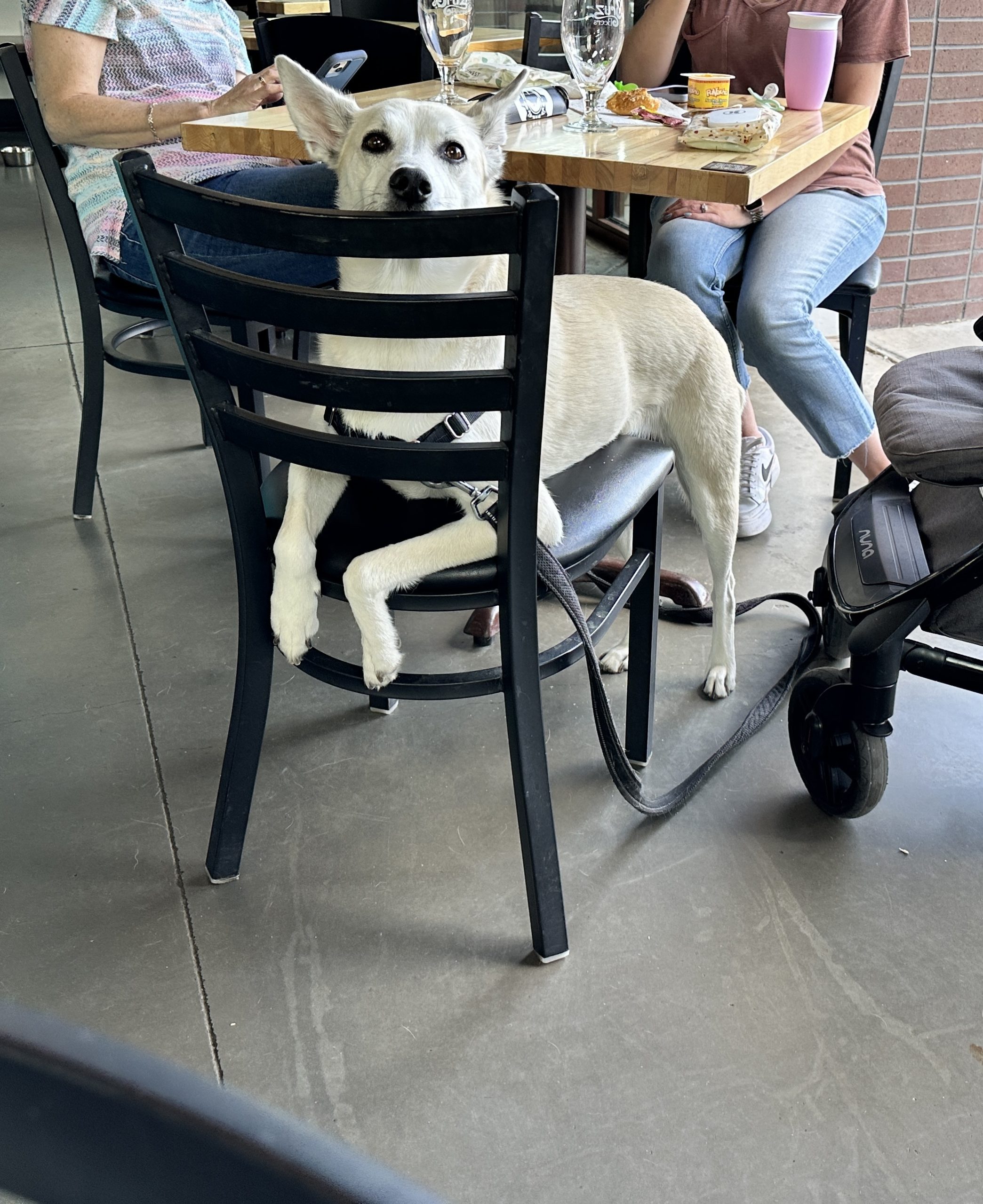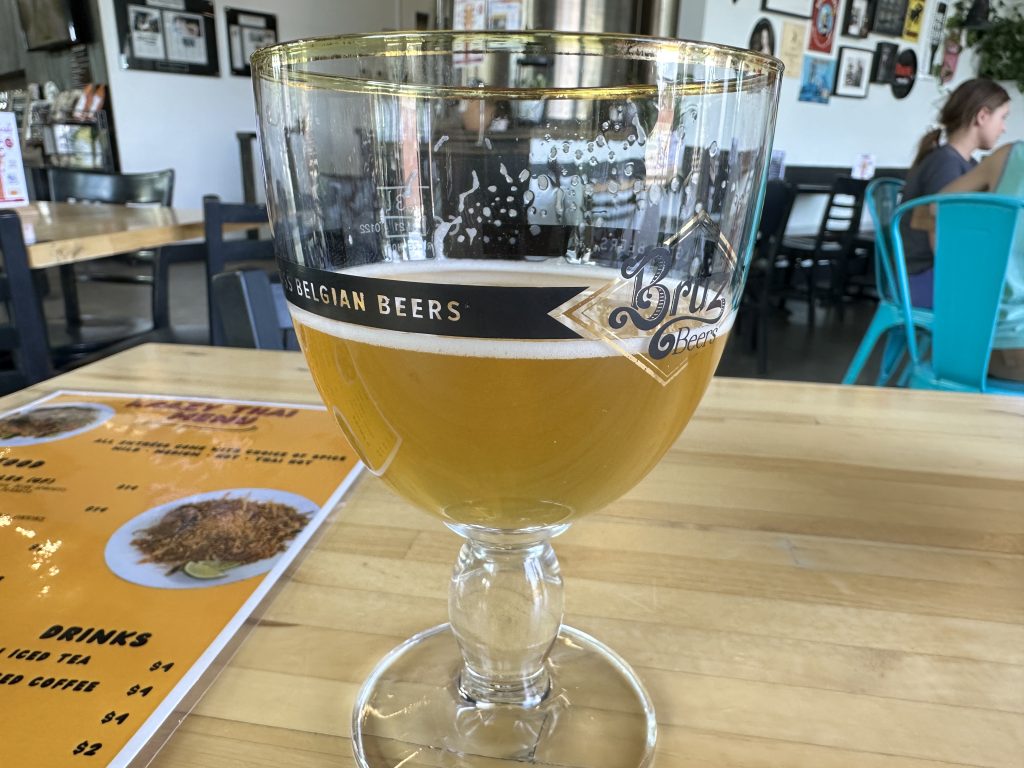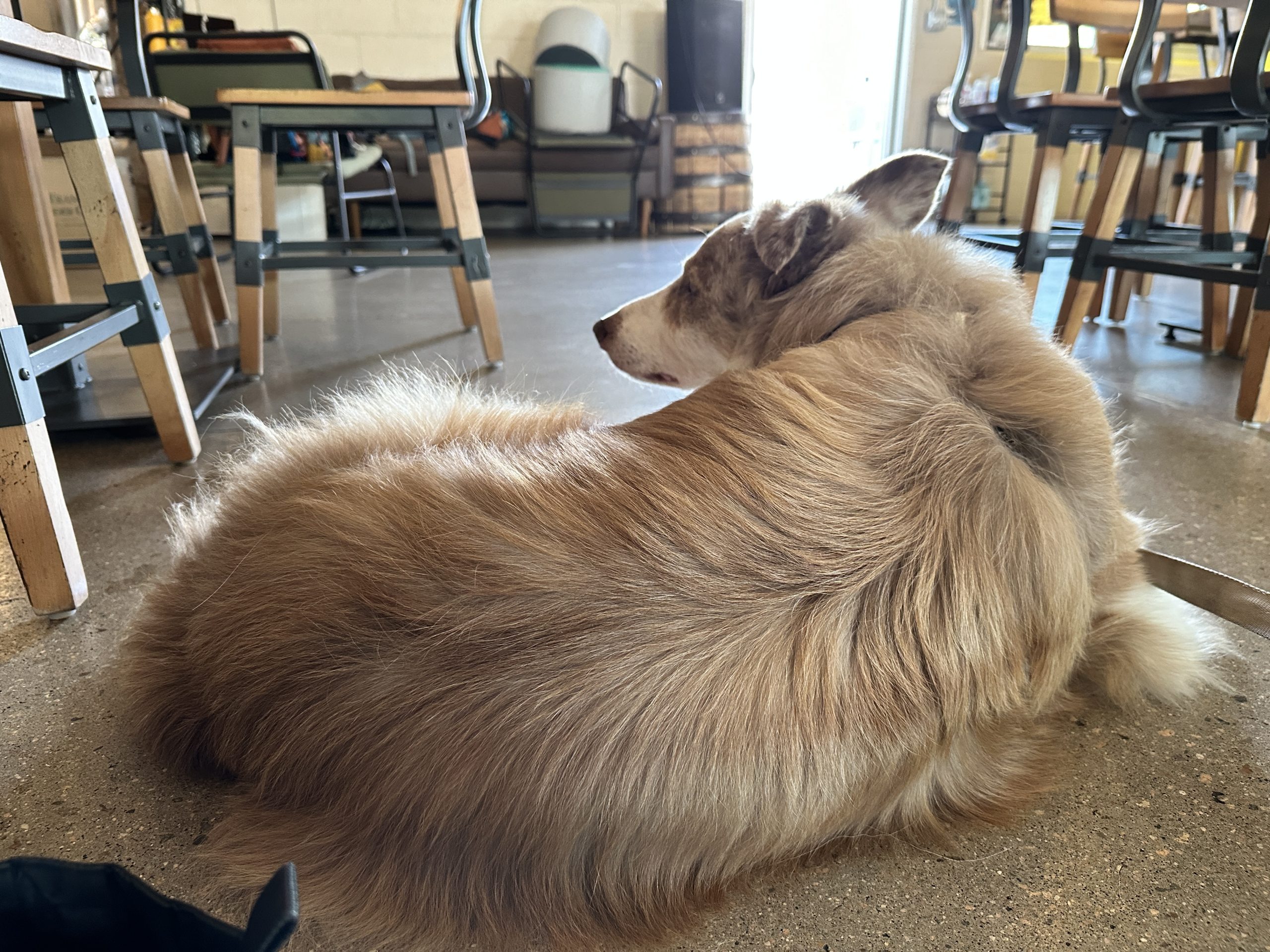 My last stop of the day was back to an old favorite: Bruz Brewing, which specializes in Belgian beers. I love the vibe of the pace, and it wasn’t even remotely crowded. I wound up spending three hours there, getting dinner from the food truck. Charlie enjoyed relaxing on the cool concrete floor, and I enjoyed people watching as couples and families came and went. We also got to meet Willow, a white German shepherd mix. She says, “’Sup?”