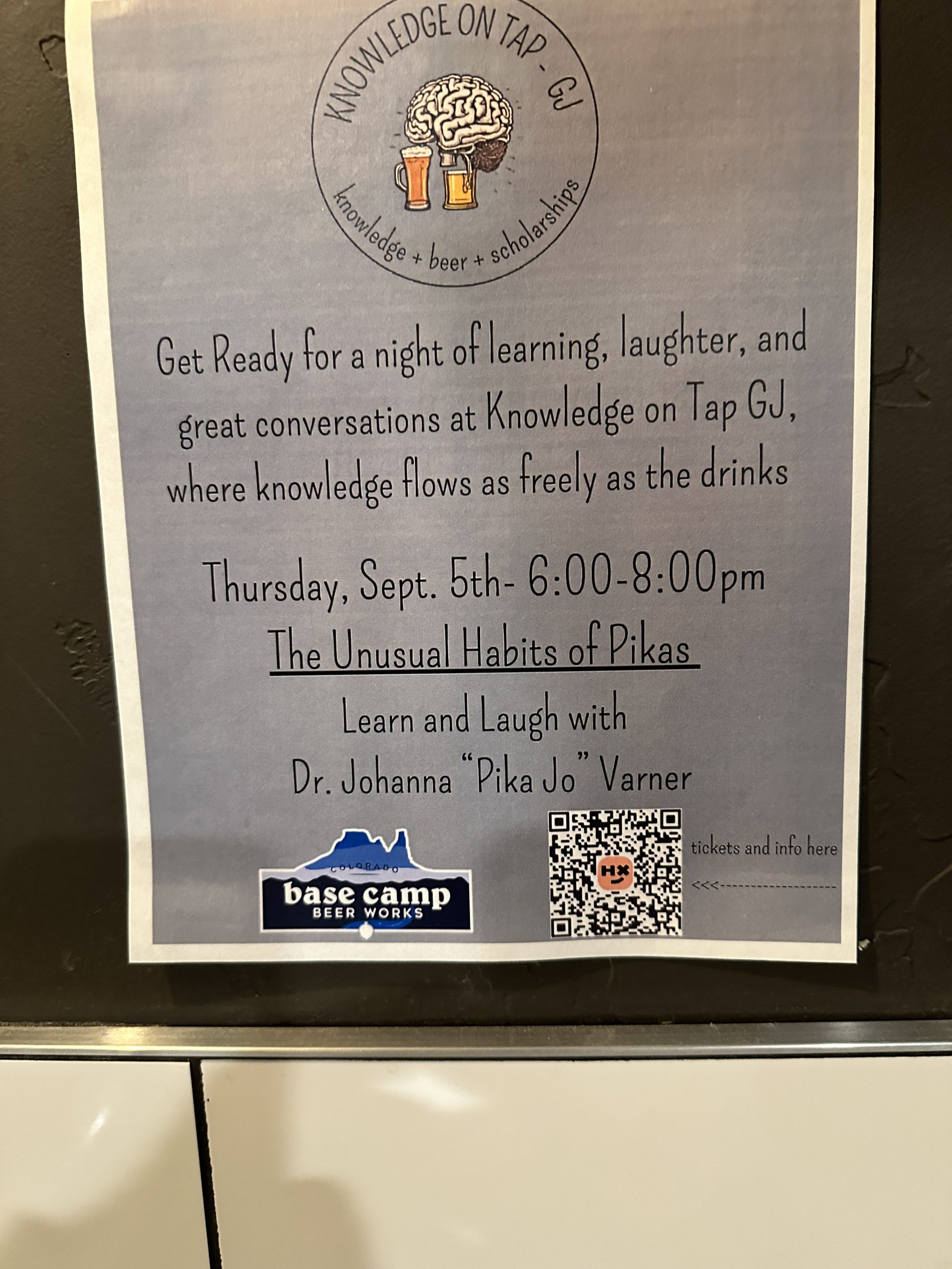 When it became clear I needed to sit down and do some work, I decided to do it on my own terms. I stopped at Base Camp Beer Works in Grand Junction, Colorado and wound up spending about three hours there, including getting lunch. They were very friendly and allowed dogs inside. I really liked the vibe of the place, and wished I was local – the lecture about pikas actually sounded pretty interesting!